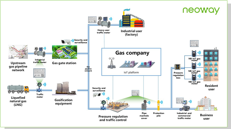 With the development of IoT technology, NB-IoT is included in the 5G protocol standards and becomes the pioneer of 5G technology. NB-IoT technology helps data collection and transmission of all kinds of gas metering equipment, pressure/temperature monitoring terminals, gas leak monitoring terminals, and gas production and control systems. This helps implement the intelligence and automation of gas company management, greatly improving the efficiency and safety of gas production, transportation, storage, and use.