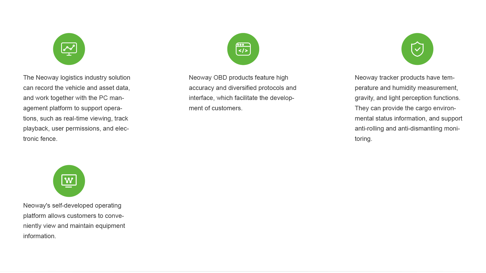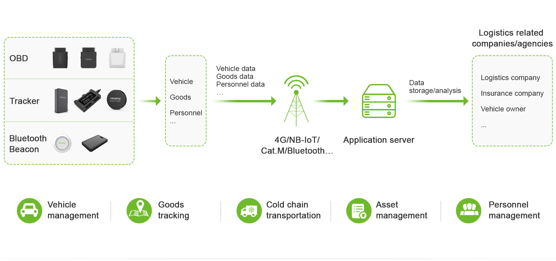 Based on the 2G, Cat.M, NB-IoT, and Cat.1 cellular communication technologies, Neoway develops the in-vehicle OBD and tracker series products that support vehicle positioning and cargo tracking. Working together with the Neoway management platform, these products can effectively solve fleet management problems for logistics companies and implement real-time tracking and positioning of cargoes.